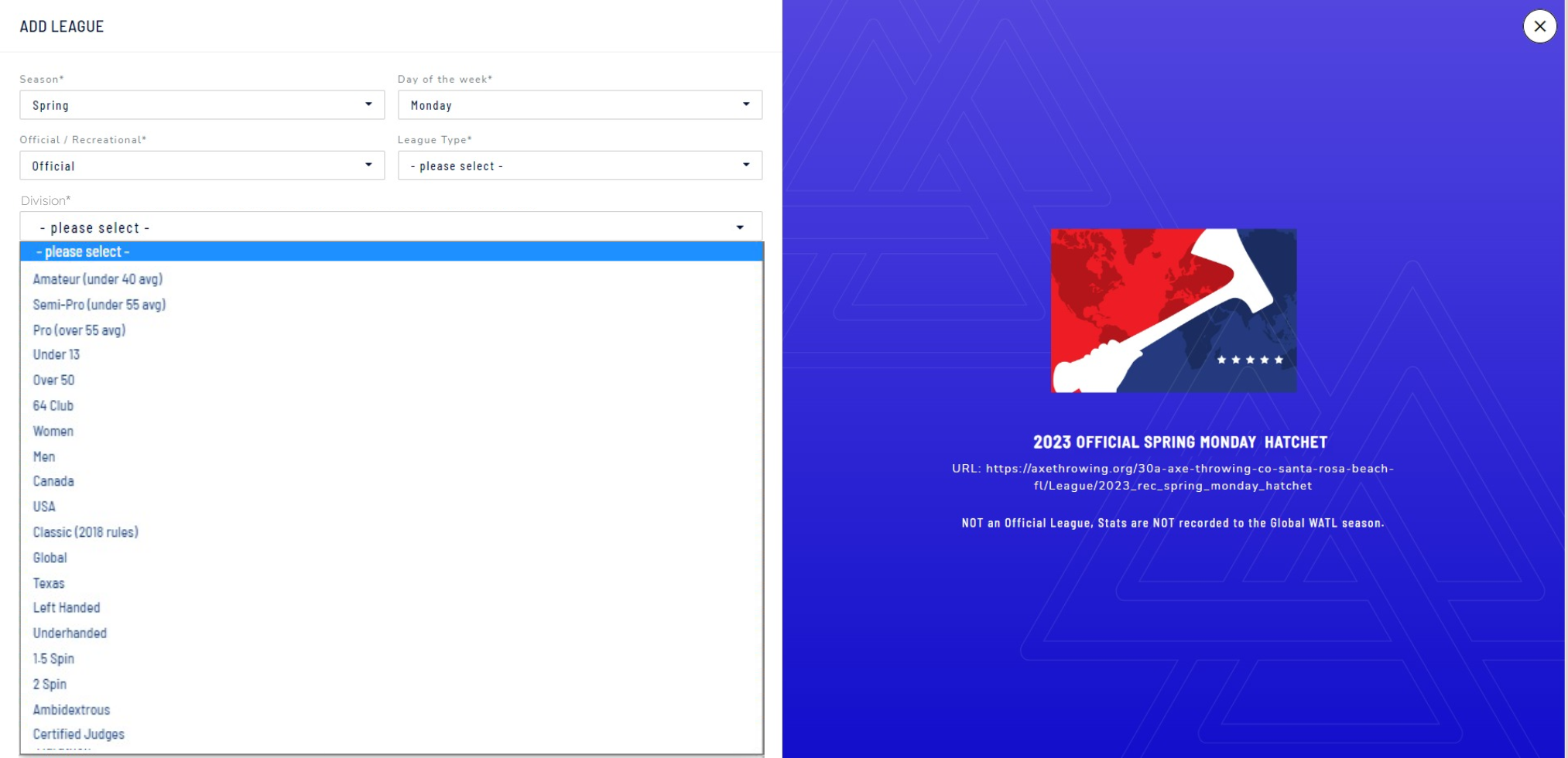 For now, these changes have only been turned on for hatchet leagues, and the app team has been working incredibly hard to get this ready for a full season ahead of the anticipated release. The big axe, duals, and knives divisions will still only be available starting in Summer, but for those interested in forming divisional leagues in hatchet, talk to you Spring league runners!