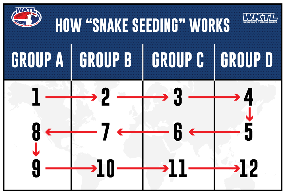 • Seeding for Stage 2 groups is determined by the results of Stage 1 seeding scores. The competitors from Stage 1 will then be snake seeded* into Stage 2 groups.