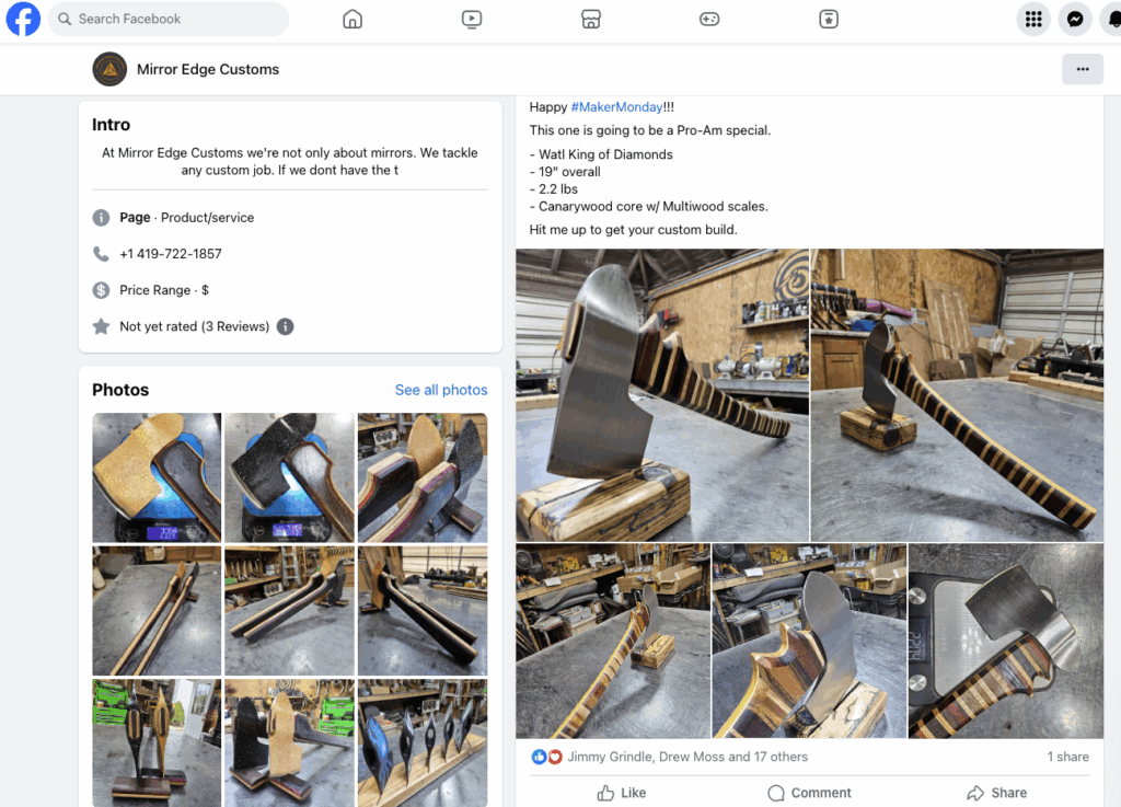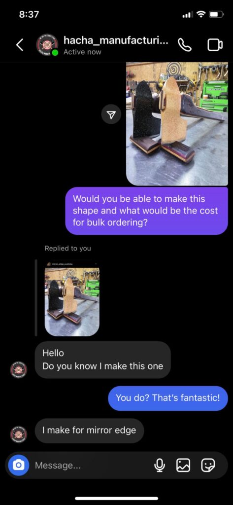 Additionally, our investigation revealed that “your supplier/manufacturer, Hacha, admitted that they make these axes for you and specifically call you by your name, Mirror Edge.”