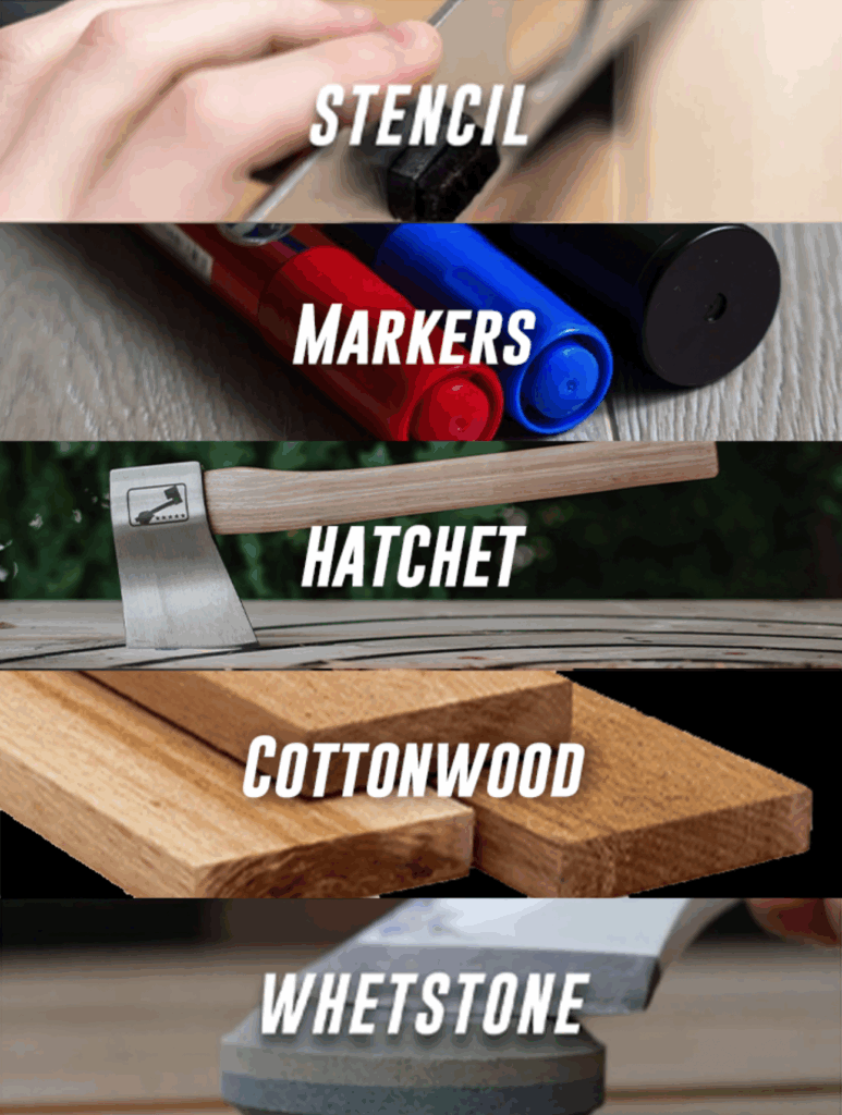 3 (36″) Cottonwood Boards, 1 Stencil, 1 Set of Refillable Markers (Black, Red, Blue), 1 Whetstone. 1 WATL Axe